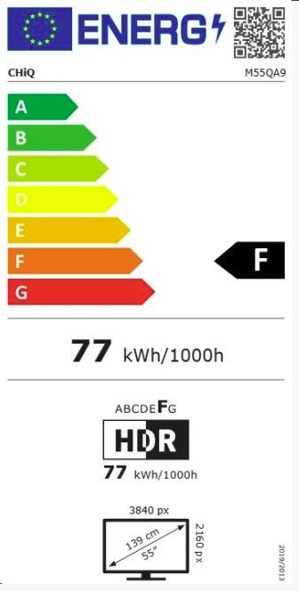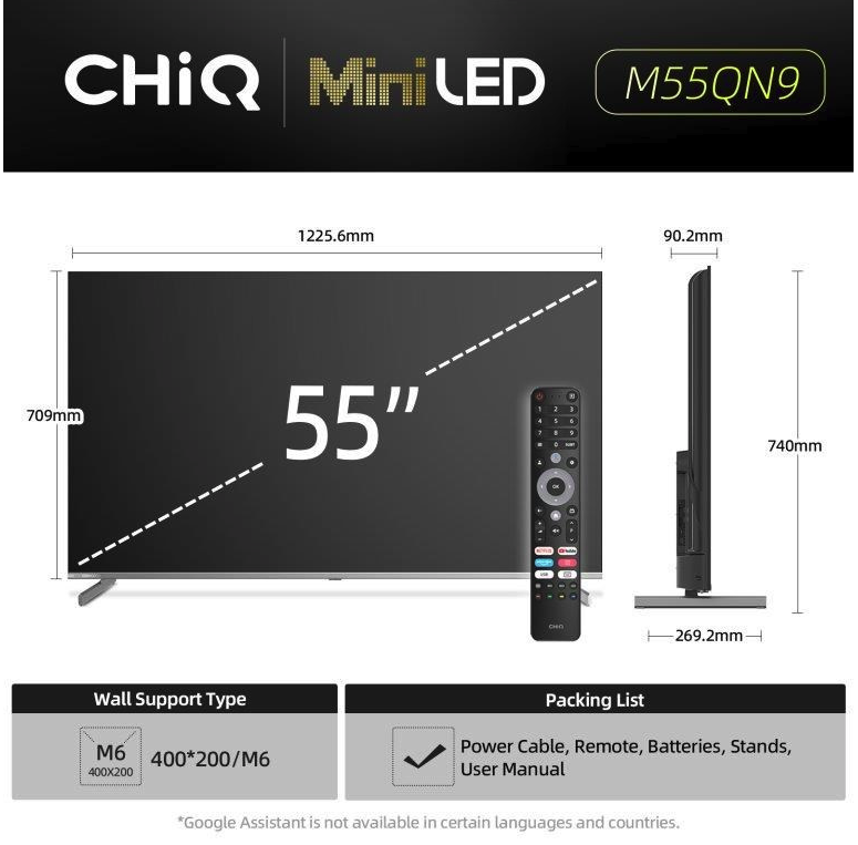 CHiQ M55QN9V • 55" (139 cm) • metalická bezrámečková Smart MiniLED Google TV 5.0 • Ultra HD (4K) • DLG 120 Hz • MEMC • lokální stmívání • Dolby Atmos • Dolby Audio • dbx-tv • HDR 10 • HLG • Dolby Vision • WiFi 2,4/5G • Bluetooth 5.0 • webový prohlížeč • Google Assistant • Chromecast • O2 TV • YouTube • Netflix • Prime Video • paměť 2GB+16GB • 4x HDMI • 2x USB • CI slot •20 W • energetická třída F