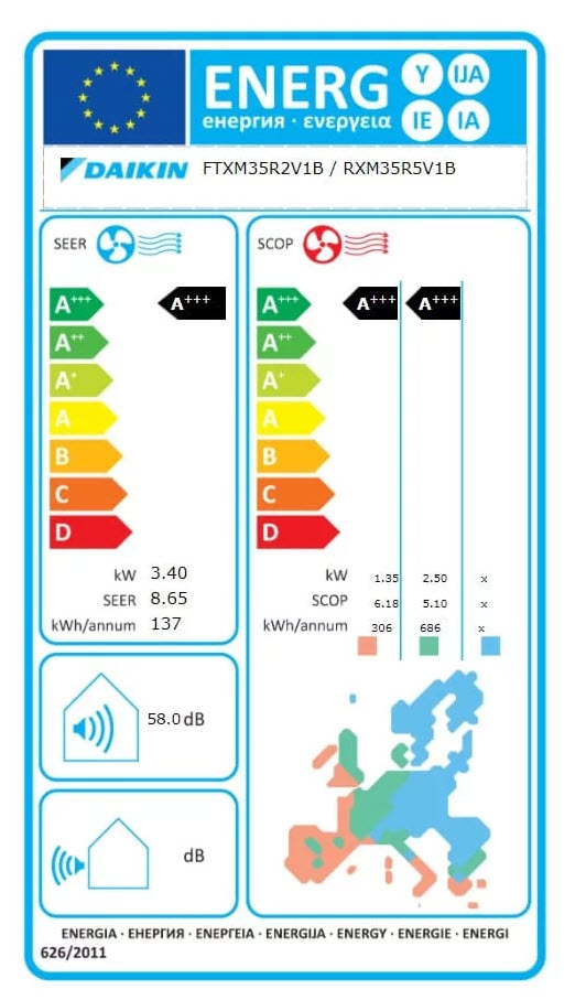 • ROČNÍ SPOTŘEBA ENERGIE V REŽIMU CHLAZENÍ/TOPENÍ : 186 kWh/a, 686 Wh/a