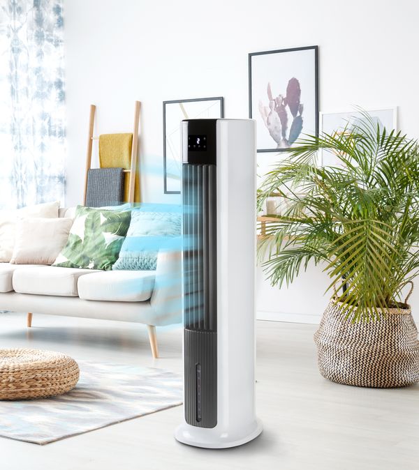 mobilní ochlazovač vzduchu • Průtok vzduchu: 500 m3/h • Hlučnost: 40-64 dB(A) • Příkon: 65 W • Objem 7 • lDoba provozu při plném zásobníku vody: +/- 6 h • Zvlhčovací výkon: až 1100 ml/h • ukazatel hladiny vody • 2 nádobky s chladícím gelem pro ochlazení vody v zásobníku • Nastavitelný časovač pro automatické vypnutí až na 10 hodin • 4 rychlosti otáček ventilátoru
