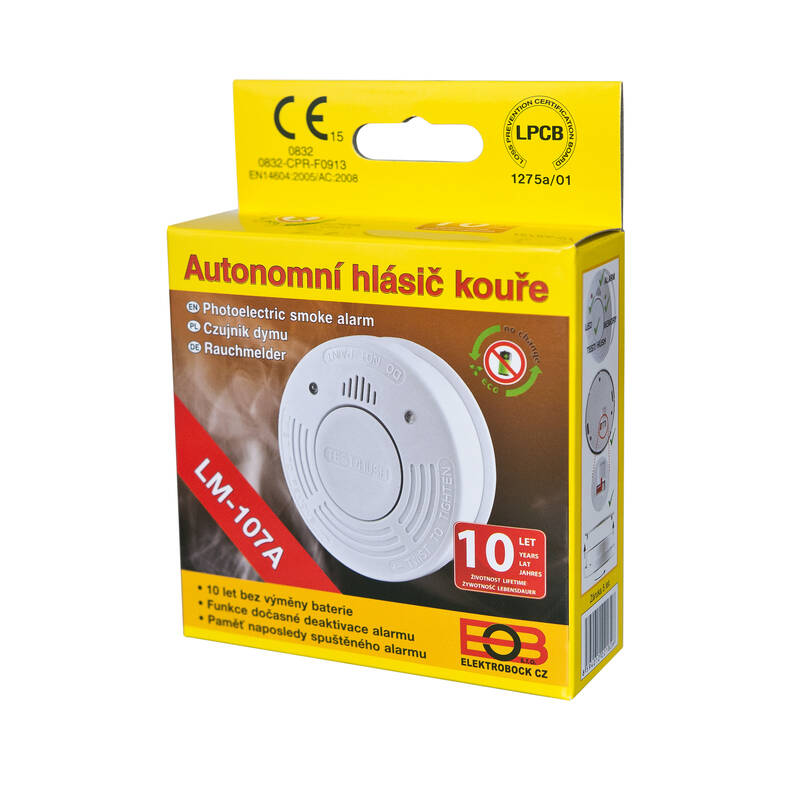 detektor kouře • bezdrátový provoz • výdrž baterie 10 let • optická a akustická signalizace • paměť alarmu • pracuje na principu rozptýleného světla • nelze namontovat bez baterie • indikace slabé baterie • rychlé testování stiskem tlačítka • hlasitost 85 dB • krytí IP42