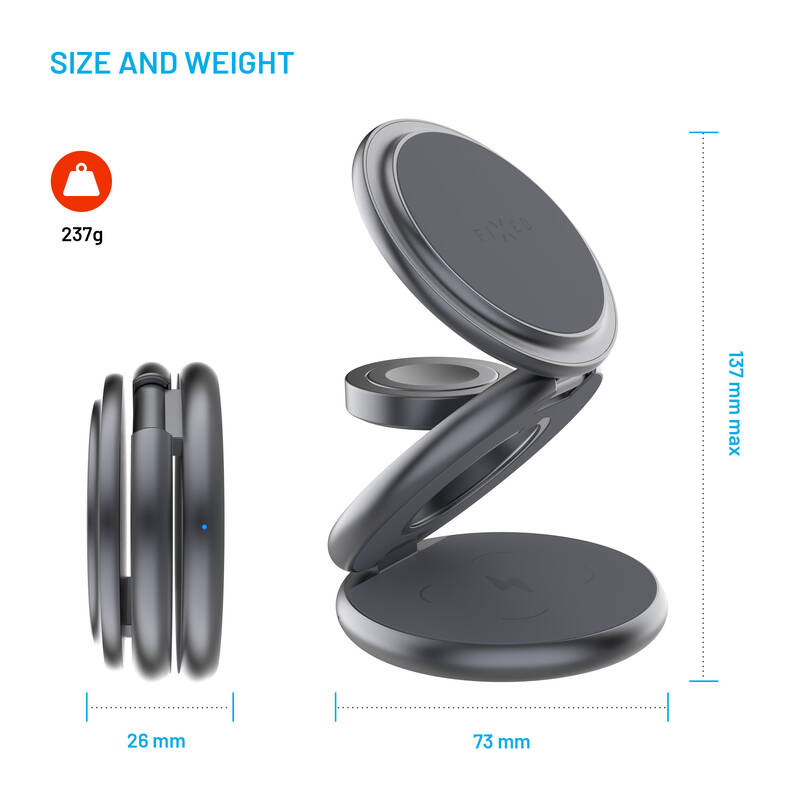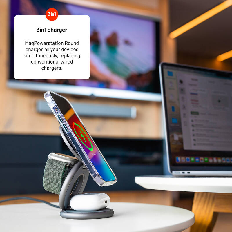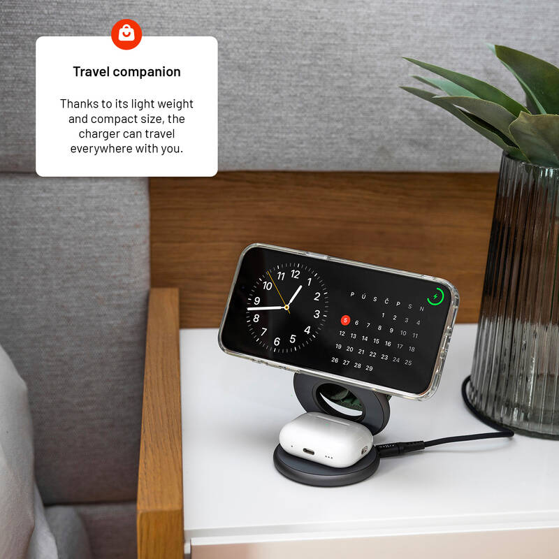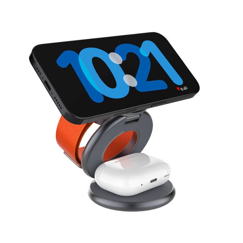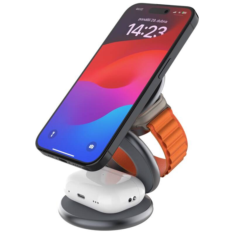 Bezdrátová nabíječka • vhodná pro mobilní telefon, hodinky a sluchátka zn. Apple • konektor USB–C • nabíjecí plocha pro Apple Watch 2,5 W • sekundární nabíjecí plocha 3,5 W • až pro 3 zařízení • stojánek • kompatibilní s MagSafe • LED indikátory • vstup 12 V / 2 A, 9 V / 2 A • výkon 15 W • rozměry stojánku jsou 11,8 × 10,7 × 6,8 cm • materiál: PC + ABS + slitina hliníku • barva: šedá • hmotnost: 0,194 kg