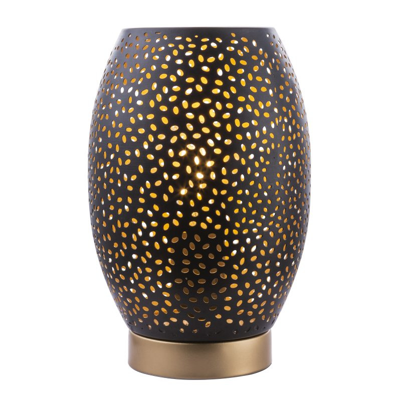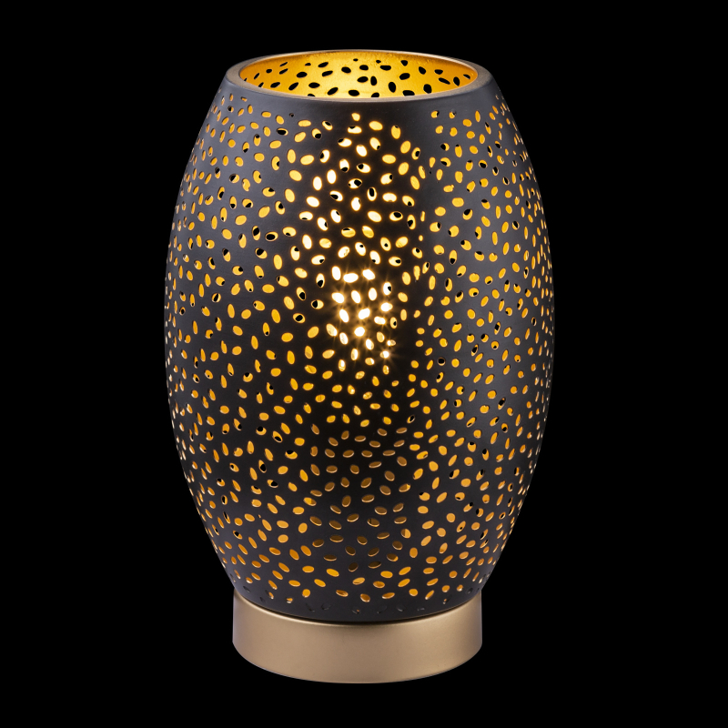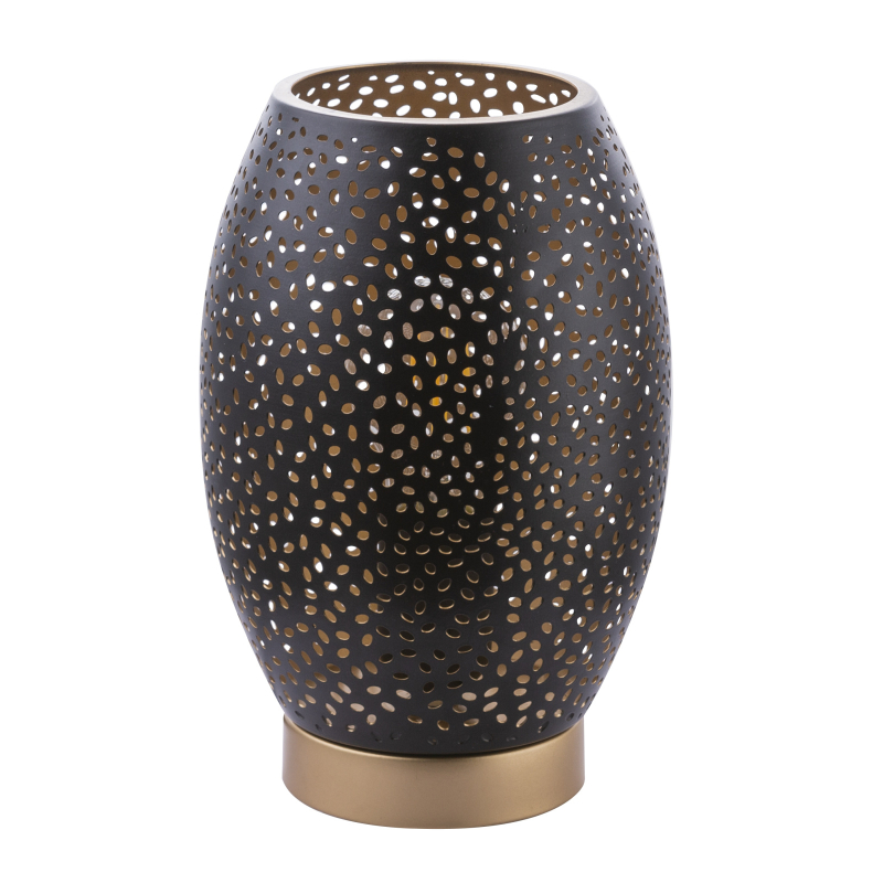 Stolní lampa • kov zlatý/ kov černý/ matný zlatý• kabel 1,5m • stínítko s dekorativním děrováním • vypínač, Ø15cm • V: 23cm, bez žárovky 1xE27 • max. 40W 230V