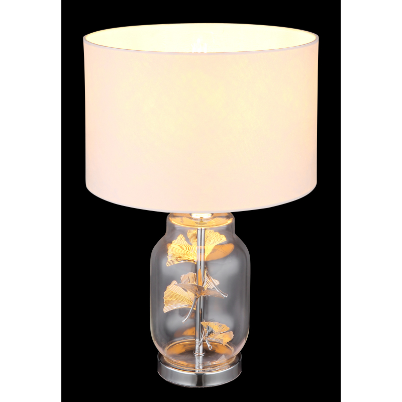 Stolní svítidlo • mkov chrom, sklo průhledné, bílý textil, bílý plast, průhledný PVC kabell • kolébkový vypínač na kabelu • ø:250mm, V:380mm • délka kabelu 1500mm • bez žárovky 1xE27 • max. 40W 230V