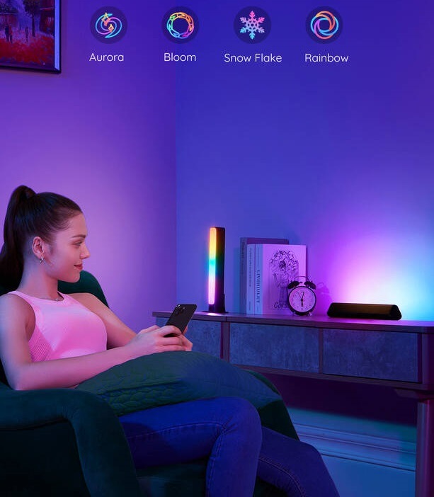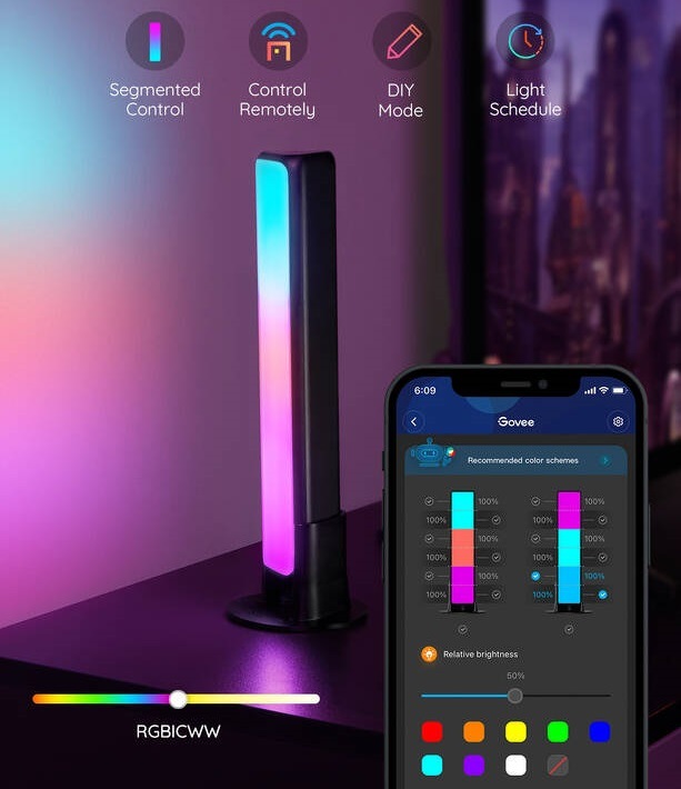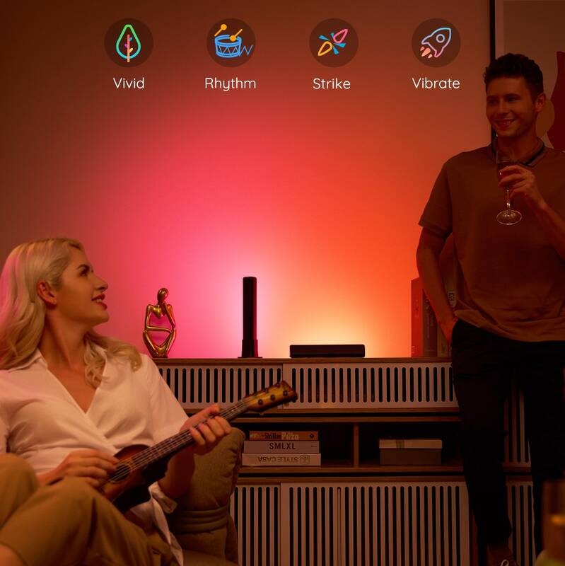 LED osvětlení • příkon 24 W • technologie RGBICWW • integrovaný mikrofon pro synchronizaci s hudbou • životnost 50 000 hodin • stmívatelnost 1–100 % • barevná teplota 2 200 až 6 500 K • světelný tok 400 lumenů • Bluetooth • Wi-Fi • mobilní aplikace • v balení: 2× světelná tyč, ovládací jednotka, adaptér do sítě, 2× držák pro montáž na stůl, 2× držák pro montáž na obrazovku