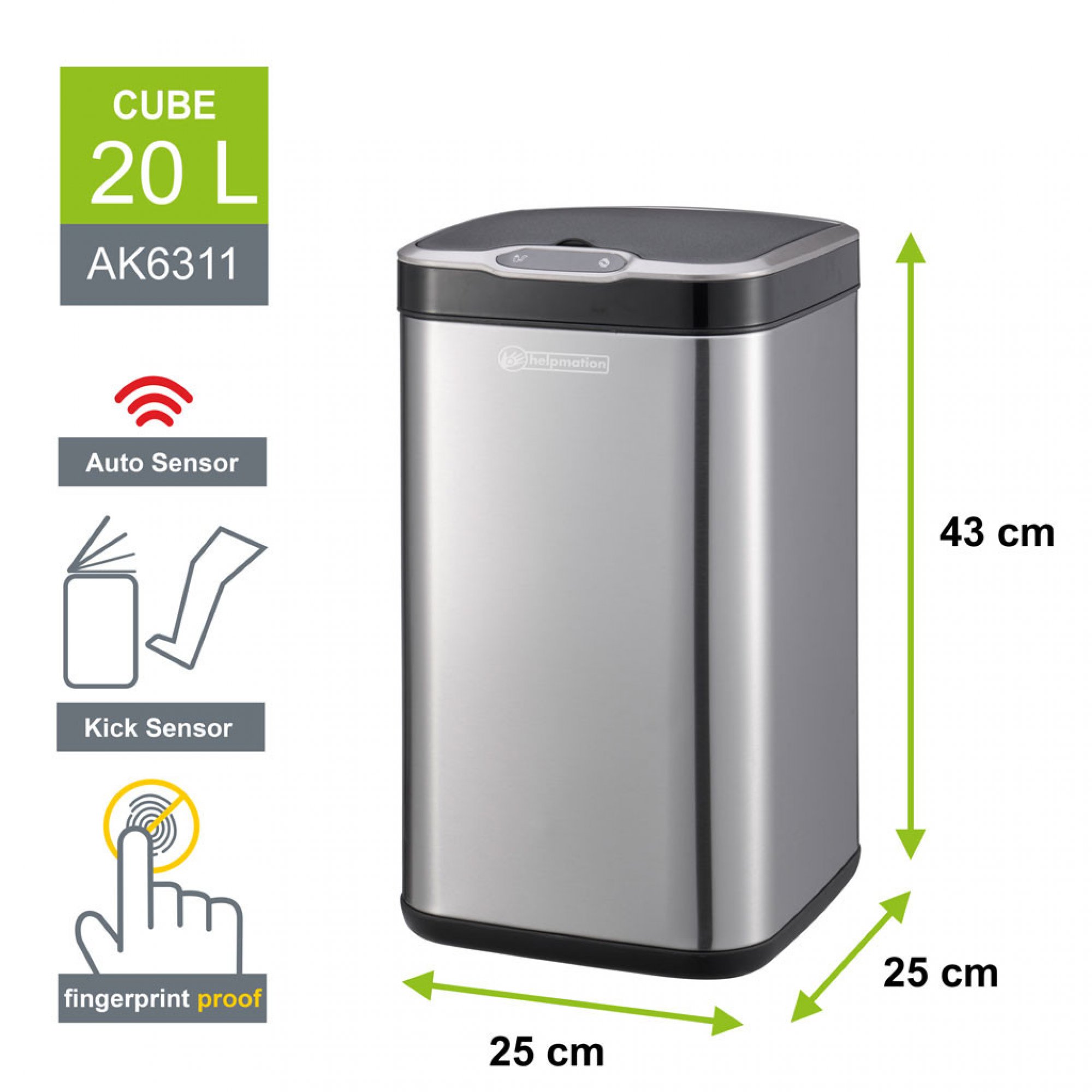 Objem 20 litrů •100% bezdotykový provoz sníží výskyt bakterií •Koš vyroben z matné nerez oceli • IR senzor, Kick senzor • ochrana proti otisku prstů • Možnost manuálního otevírání tlačítky • Tiché otevírání a zavírání víka • Pojistný kruh k zajištění odpadkového pytle