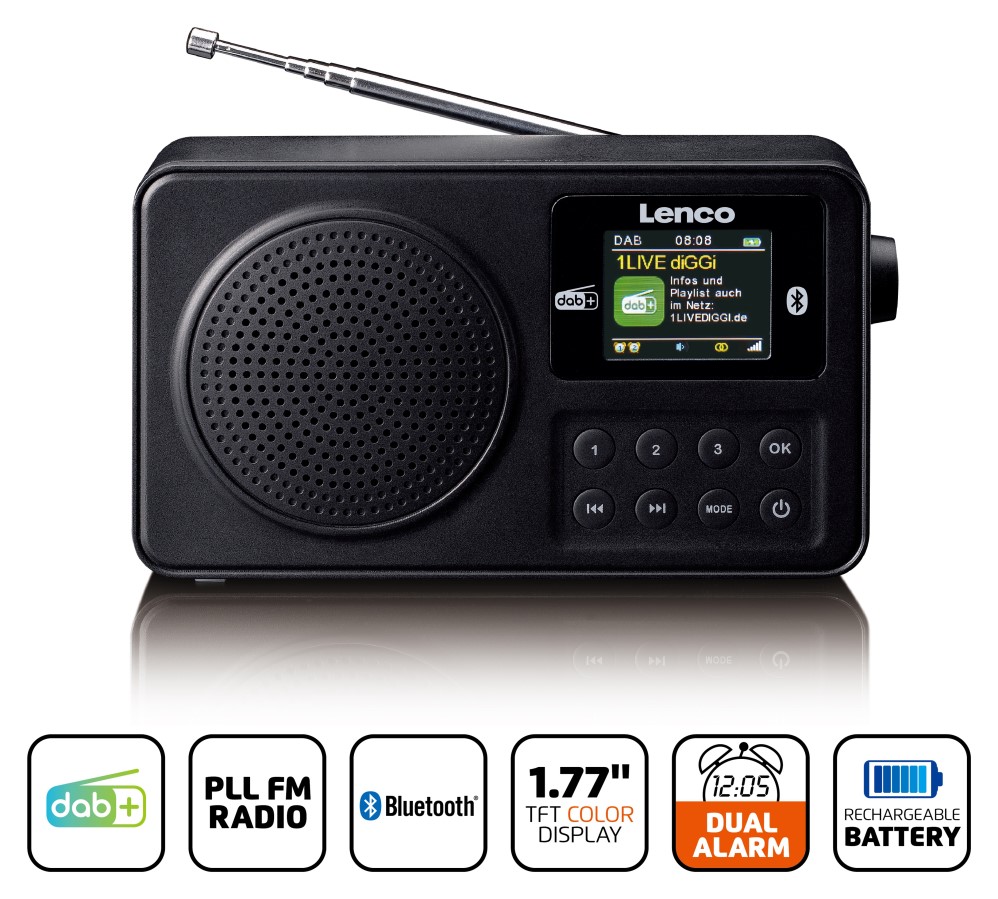 Přenosné DAB+/FM rádio s Bluetooth • digitální rádio DAB+ • PLL FM rádio s funkcí RDS • Bluetooth 5.3 • 3 tlačítka přímé předvolby • paměť na 20 stanic • ekvalizér • barevný TFT LCD displej 1,77” (4,5 cm) • funkce hodin a budíku • časovač vypnutí • výstupní výkon: 2 Watt (RMS) • vstup AUX 3,5 mm • výstup 3,5mm jack • teleskopická anténa • dobíjecí Li-Ion baterie DC 3,7V 1900mAh • kapacita baterie: až 10 hodin • napájecí kabel USB-C • rozměry: 16,1 x 4,6 x 9,1 cm (šxhxv)