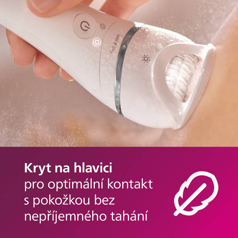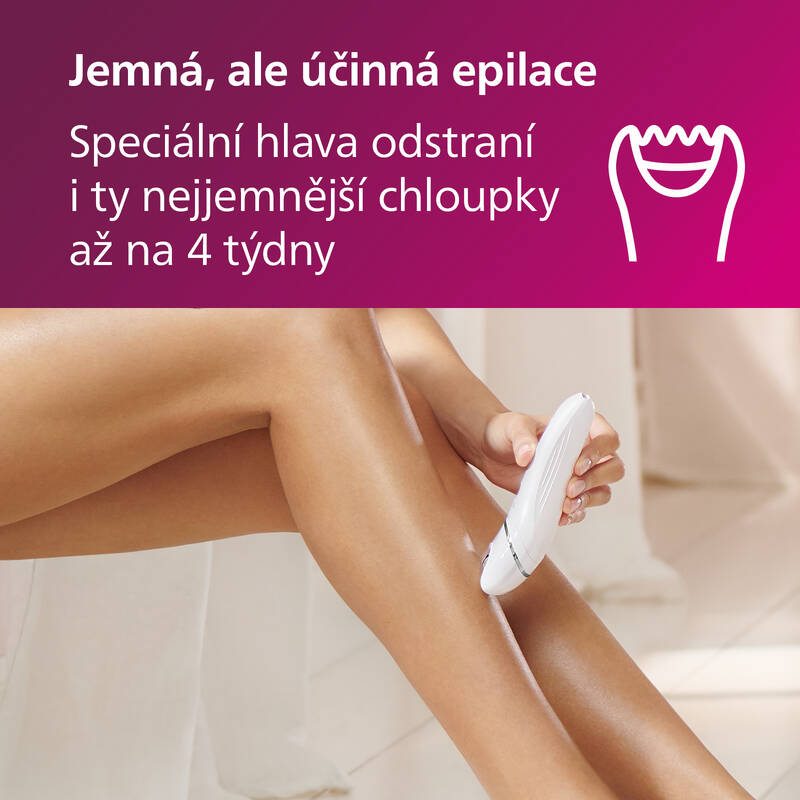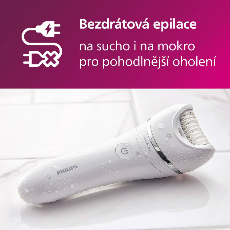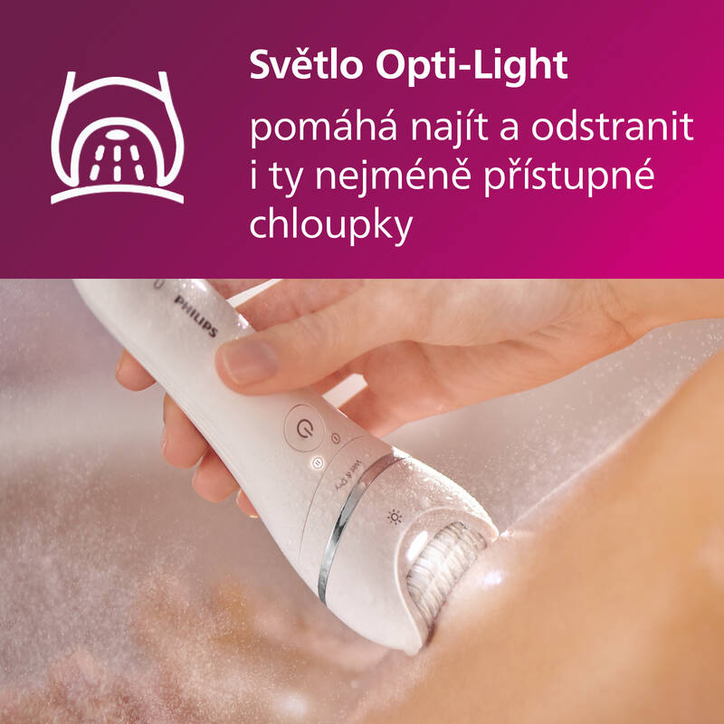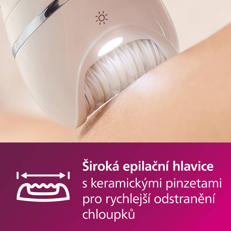 dámský epilátor • bezdrátový provoz • pro mokré i suché holení • 2 rychlosti • pro péči o tělo i obličej • keramické disky se sestavou 32 pinzet • ergonomická rukojeť ve tvaru S • protiskluzový povrch • světlo Opti-light