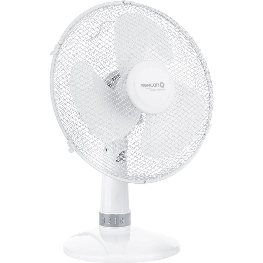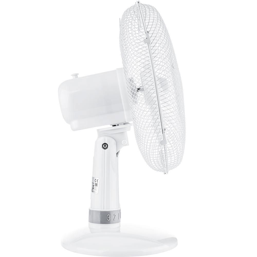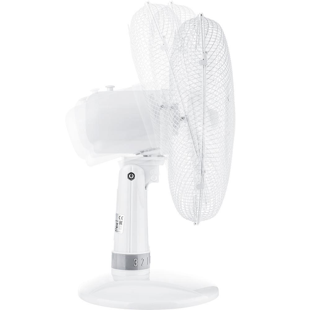 Stolní ventilátor • 3 rychlosti • Průměr lopatek 30 cm • Automatická horizontální rotace v úhlu 90° s možností vypnutí • Nastavitelný úhel sklonu • Příkon: 40 W • Hlučnost: 50 dB(A) • Rozměry (šířka x hloubka x výška): 350 x 225 x 464 mm