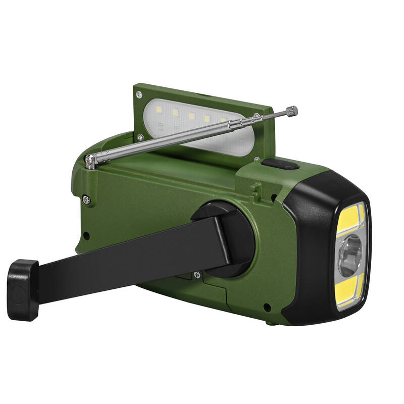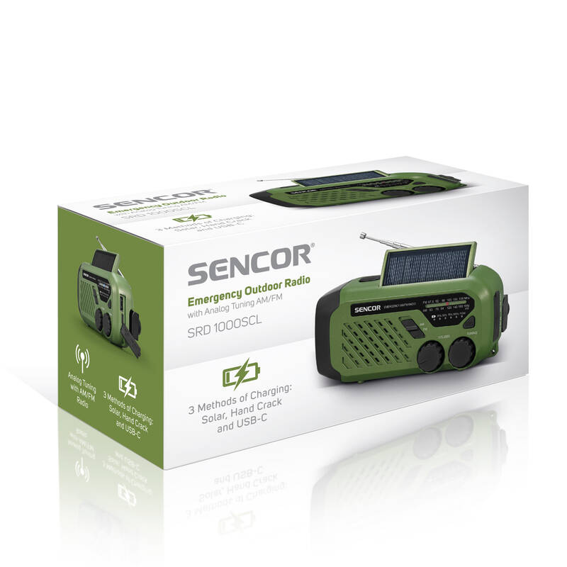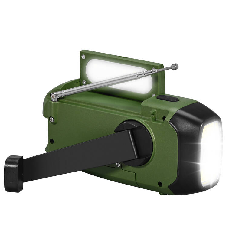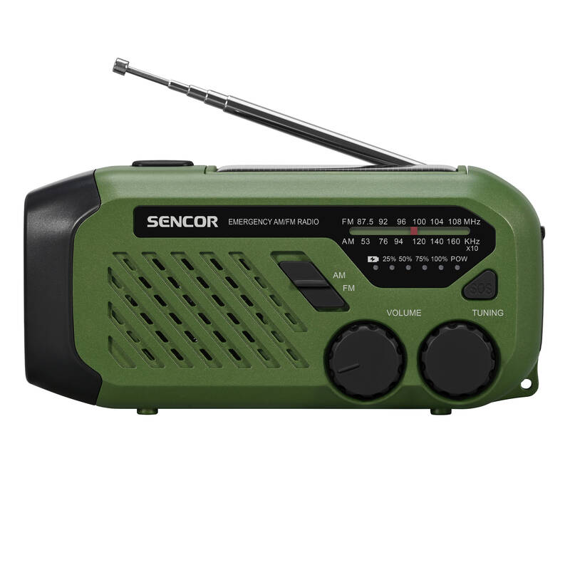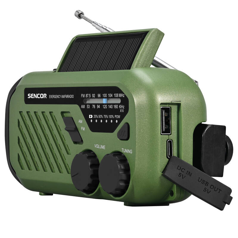 nouzové rádio • výkon 1 W • analogové vysílání AM/FM • 2 000mAh dobíjecí baterie • USB-C nabíjecí konektor • solární nabíjení • nabíjení ruční klikou • LED svítilna • IPX4 • teleskopická 360° anténa • SOS alarm • funkce powerbanky