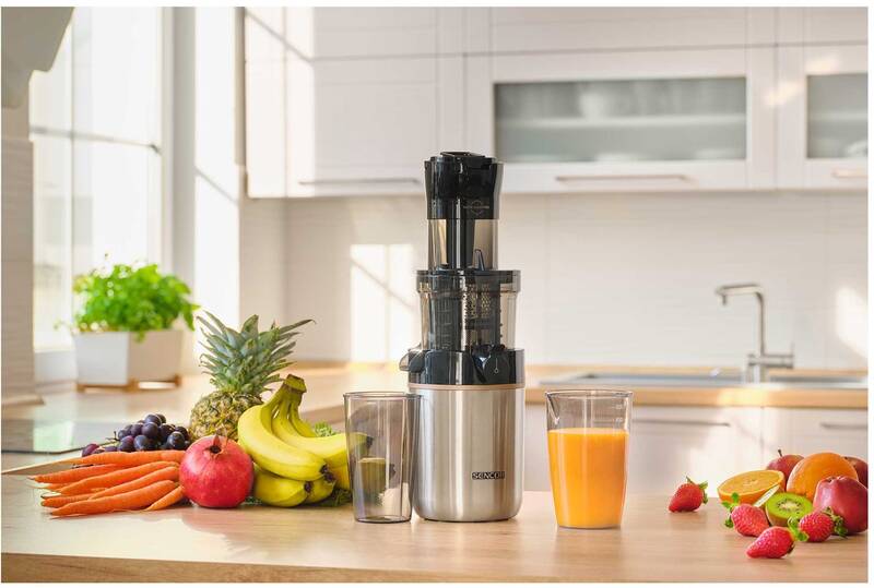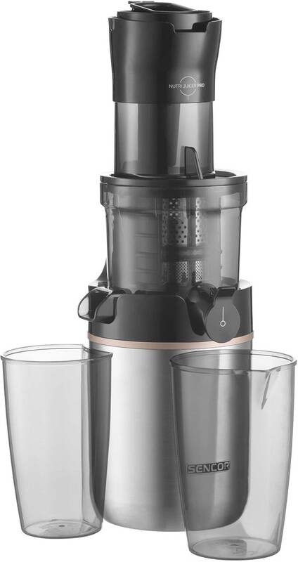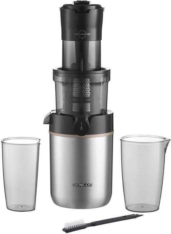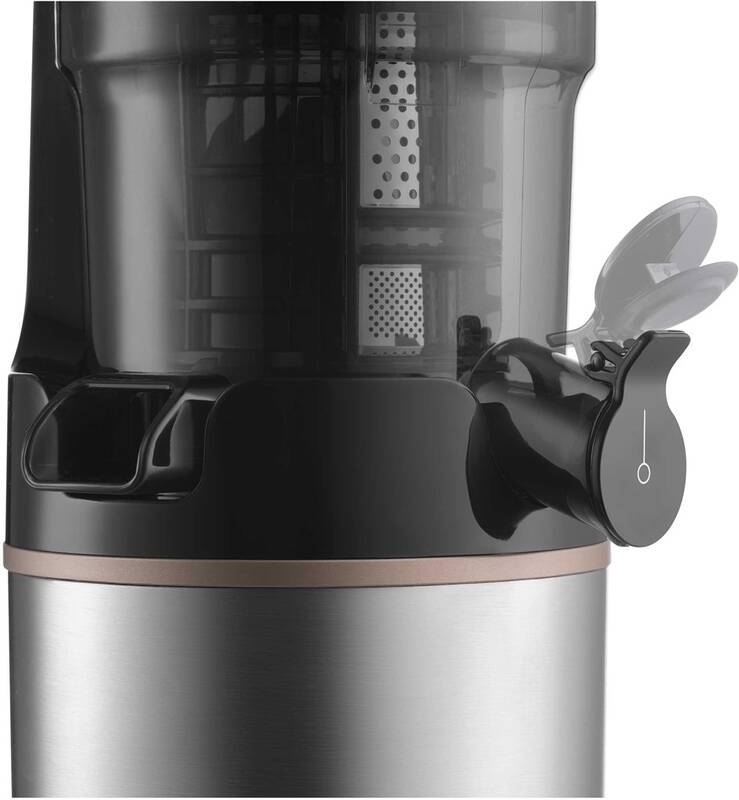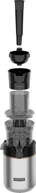 odšťavňovač • příkon 200 W • šnekový • objem nádoby na šťávu 800 ml • nerezový filtr • objem nádoby na dužinu 600 ml • 65 ot./min. • funkce pro zpětný chod • technologie DripStop bránící odkapávání • široká podávací trubice • průhledné víko