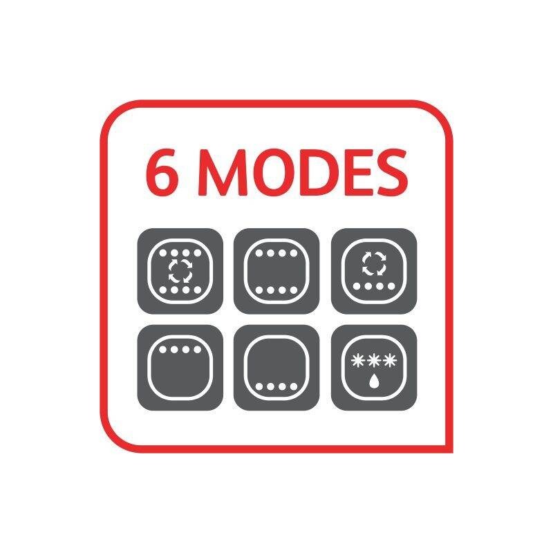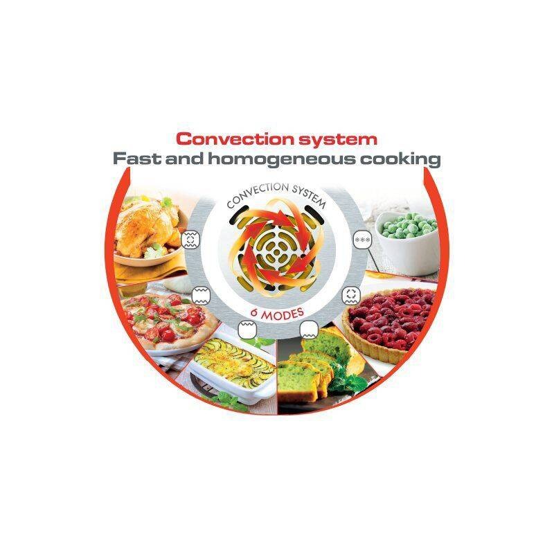 Uživatelsky příjemná kompaktní pečicí trouba o kapacitě 19 l, termostat do 240°C, časovač do 120 min., šestipolohový volič režimu 6 režimů přípravy pokrmů: konvekční, tradiční, gril, pečivo, vodní lázeň, rozmrazování, vyjímatelný rošt s šesti výškovými úrovněmi a pečicí plech