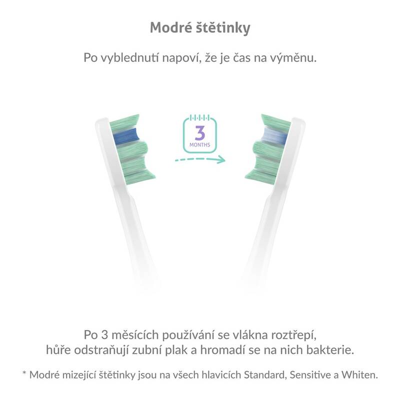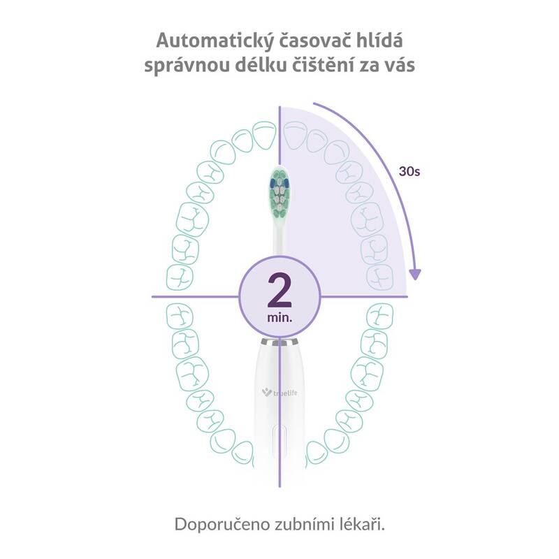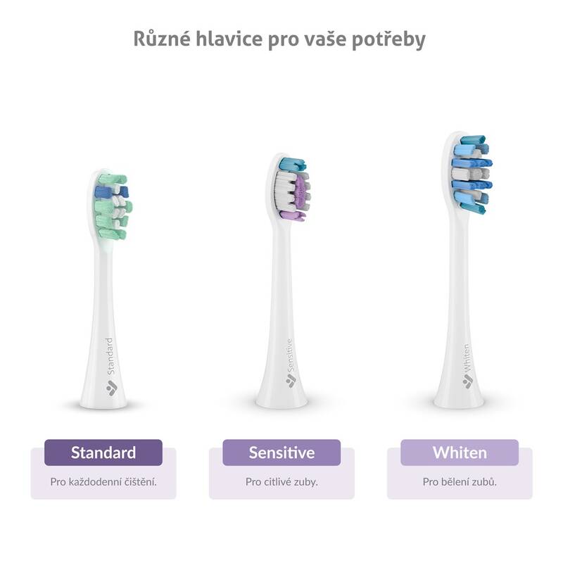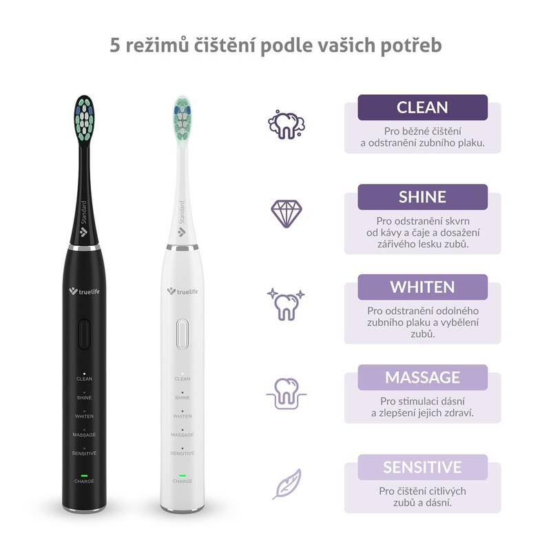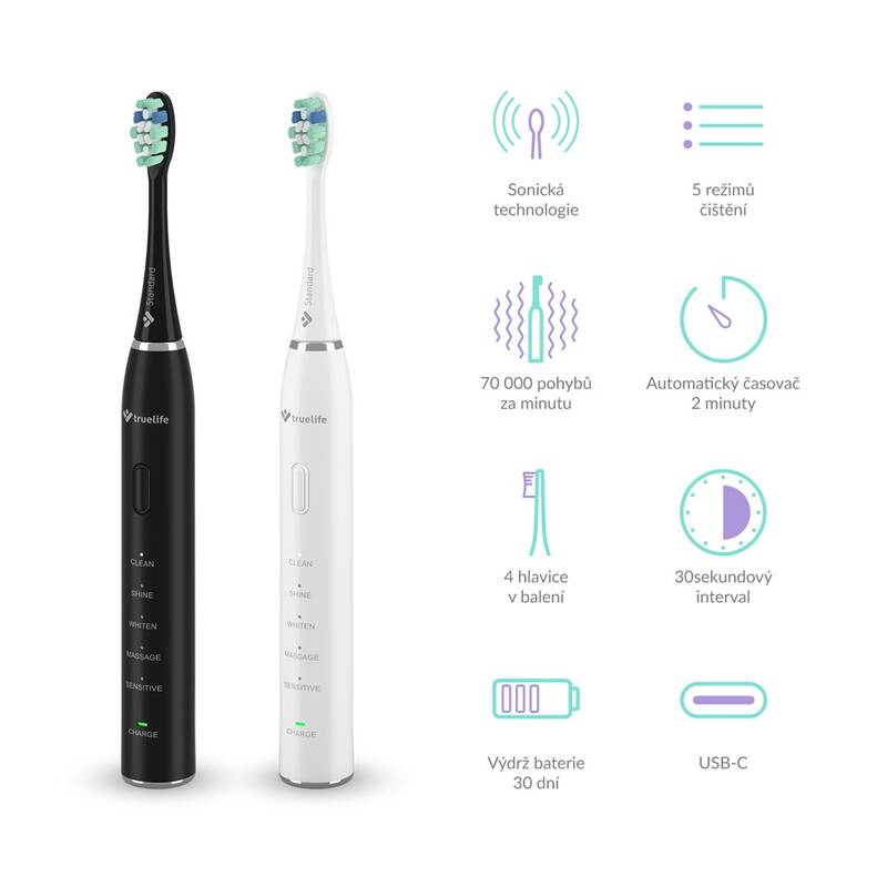 elektrický kartáček • sonický • 70 000 pohybů za minutu • 5 režimů: čištění, lesk, bělení, masáž, citlivý • napájení: Li-Ion s kapacitou 600 mAh • dvouminutový časovač • indikace výměny hlavice • 4 hlavice • cestovní pouzdro