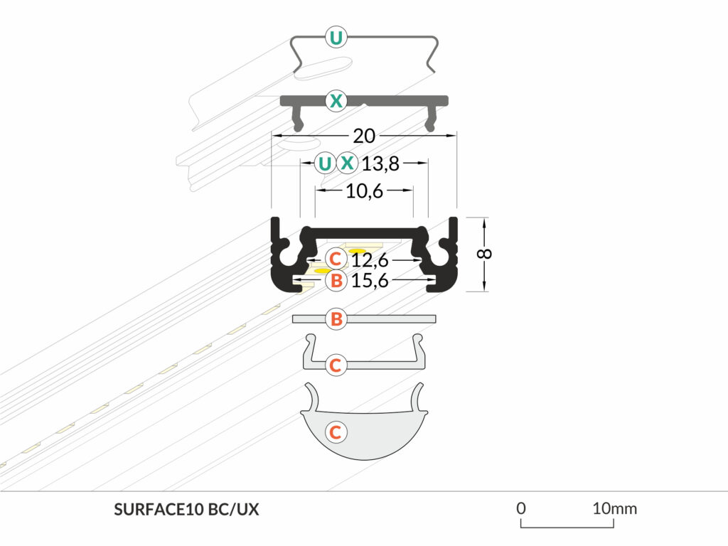 - Profil má universální použití pro pásky středního výkonu o šířce max. 10mm.