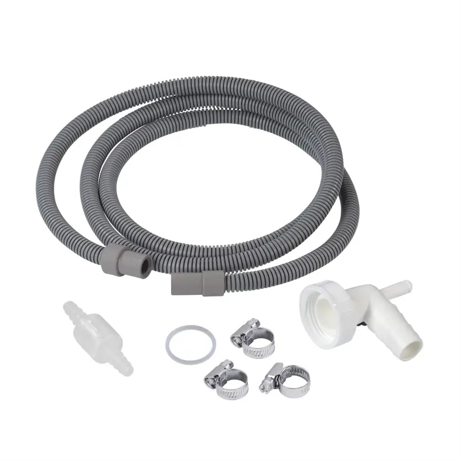 Set pro připojení kondenzační sušičky na prádlo k sifonu • obsah setu: 1x odtoková hadice (rovné připojení; vysoká odolnost vůči tlaku; délka 1,5 m; vnitřní průměr 8 mm/ 10 mm; vnější průměr 15 mm; teplotní rozsah: -40°C/ +70°C; materiál: polyethylen); 1x sifonová přípojka (připojení 20 mm pro pračky/ myčky na nádobí; připojení 8 mm pro kondenzační sušičky, převlečná matice 1"); 3x hadicová objímka; ventil zabraňující zpětnému chodu vody do sběrné nádoby.