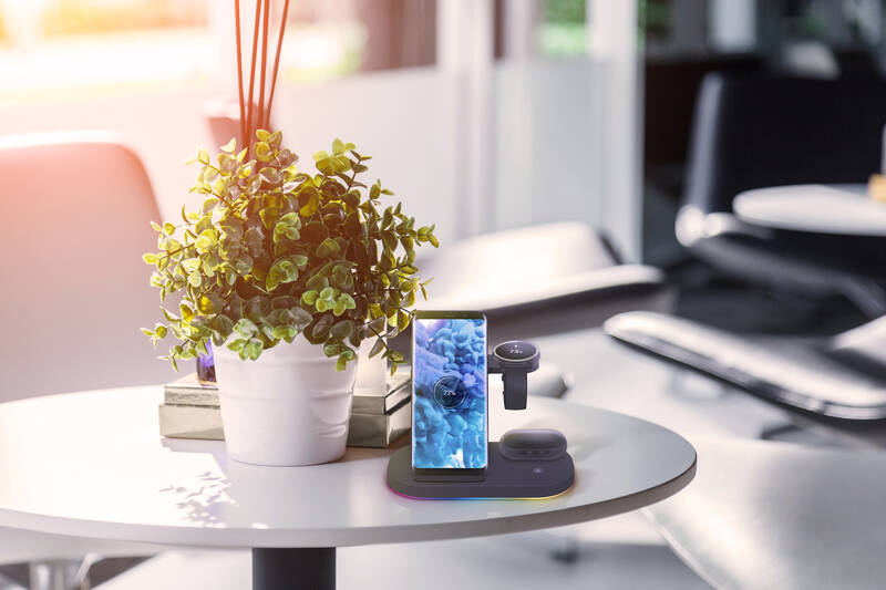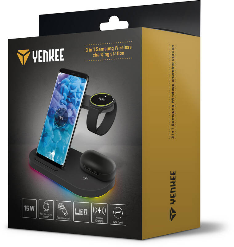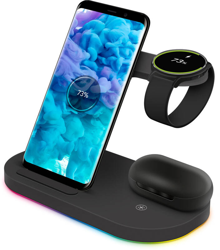 bezdrátová nabíjecí stanice • stylový design • možnost nabíjení 3 zařízení současně • podpora rychlého nabíjení 15 W • kompatibilní s produkty Samsung • max. proud 2 A • funkce stojánku • nabíjí smartphone, Samsung Watch, sluchátka • Qi standard • LED signalizace • detekce cizích předmětů • ochrana proti přehřátí, přepětí, nadproudem